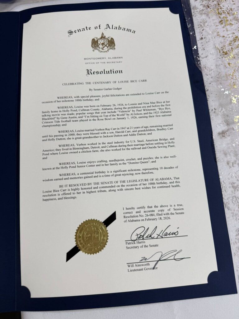 Several members of the community and local government officials attended the milestone celebration, including Randall Shedd, who shared a special birthday message from Sen. Garlan Gudger, R-Cullman, recognizing Carr’s century of life and her contributions to the community.