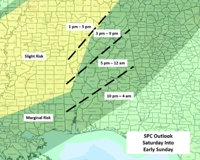 • A line of thunderstorms will enter the northwestern portions of Alabama this afternoon and move southeastward through much of the overnight hours. Damaging wind gusts and hail are the main threats, especially in the Slight Risk area. A tornado or two is also possible in the far northwestern sections, but the overall tornado threat is very low.