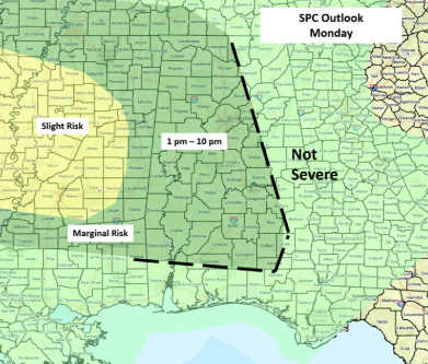 On Monday, an upper-level disturbance will produce showers and thunderstorms that will move from west to east across Alabama during the afternoon and evening hours. A few storms may produce very heavy rainfall, wind gusts from 40-60 mph, and large hail (golf ball or larger). Scattered showers and a few non-severe thunderstorms are possible north of I-20 on Tuesday.