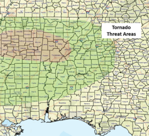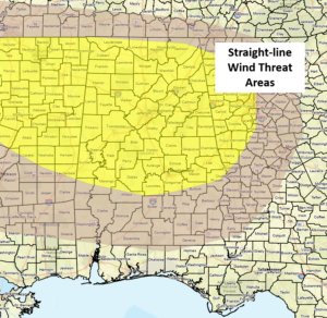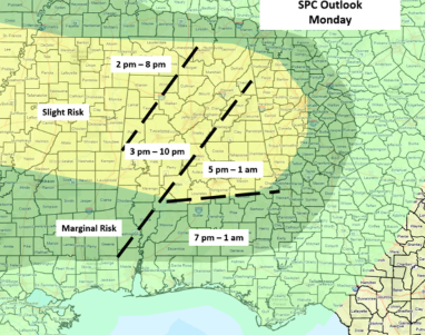 Increasing instability has led to an expansion of the Slight Risk across much of the state. Discrete cells as well as clusters of storms could produce damaging straight-line winds, very large hail (golf ball or larger), torrential downpours resulting in localized flooding, and a few tornadoes. The highest threat of tornadoes is generally north of I-20 and west of I-65, but a couple could develop anywhere within the state.