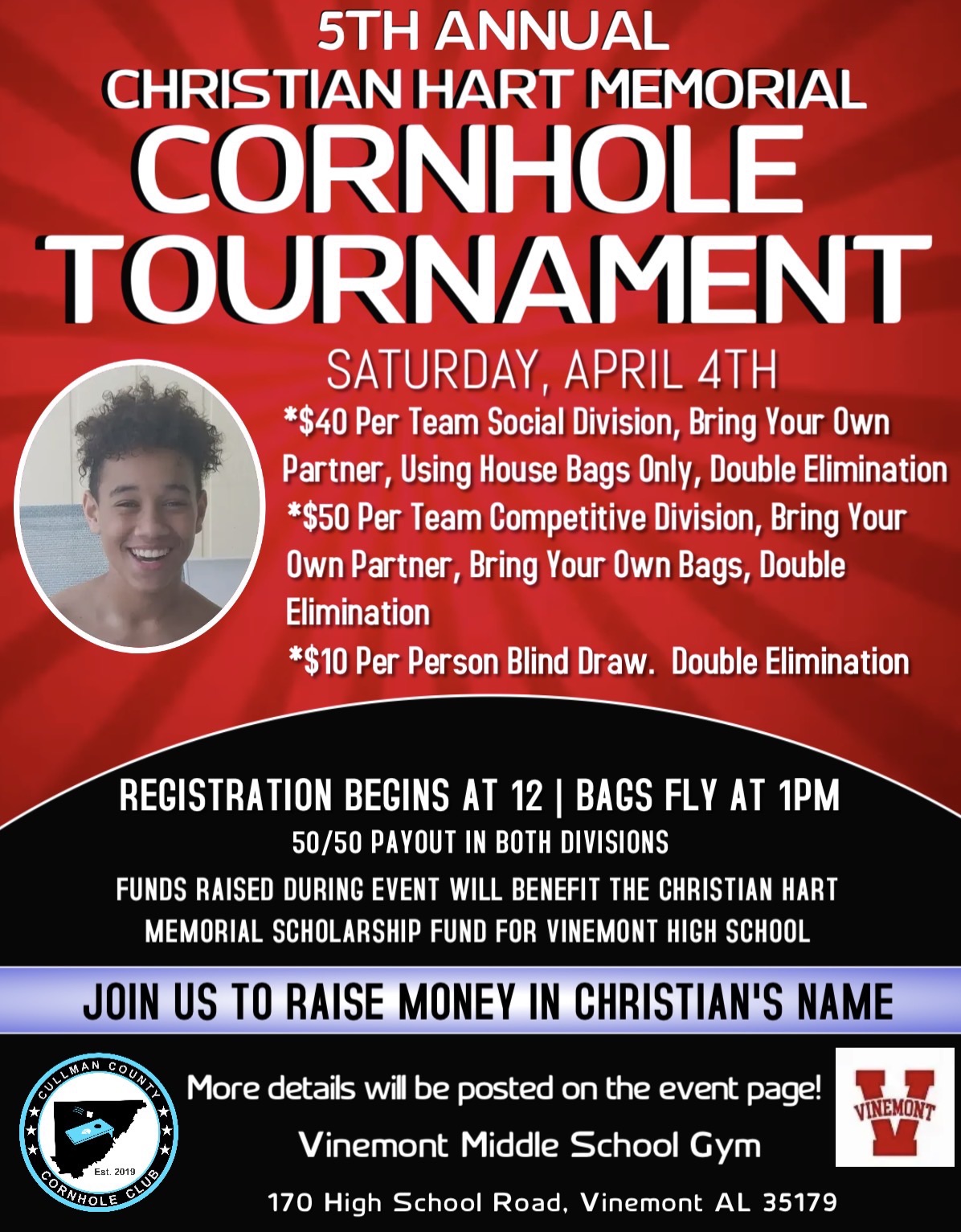 VINEMONT, Ala. – The fifth annual Christian Hart Memorial Cornhole Tournament will take place Saturday, April 4, in the Vinemont Middle School gym. Registration will begin at noon, with games starting at 1 p.m. The tournament will once again feature both social and competitive divisions.