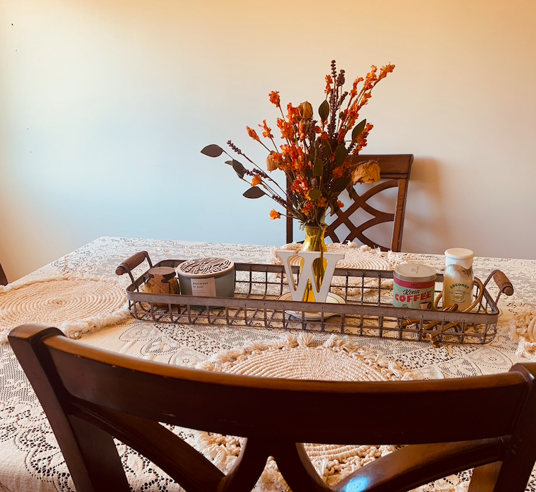 Take this dining table setup for example. The main attraction is the bouquet. It allows the pop of color that can work for both fall and spring. While it is bright, the cream tablecloth and oak chairs give it structure. The bouquet was given to me by my husband on our wedding day and I have kept it for a display. This allows for more of an emotional connection that I wouldn’t have had for something I bought for myself. The basket takes it away from the traditional style and gives opportunity for a more rustic look.