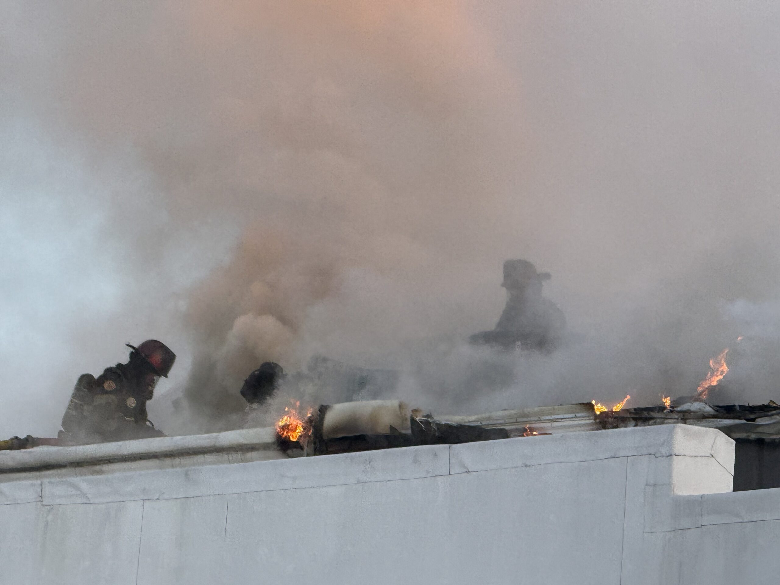 “Fire crews are currently on the roof, cutting through with saws to access the area where they believe the fire originated. A lift has also been brought into the alley to assist with roof access.”