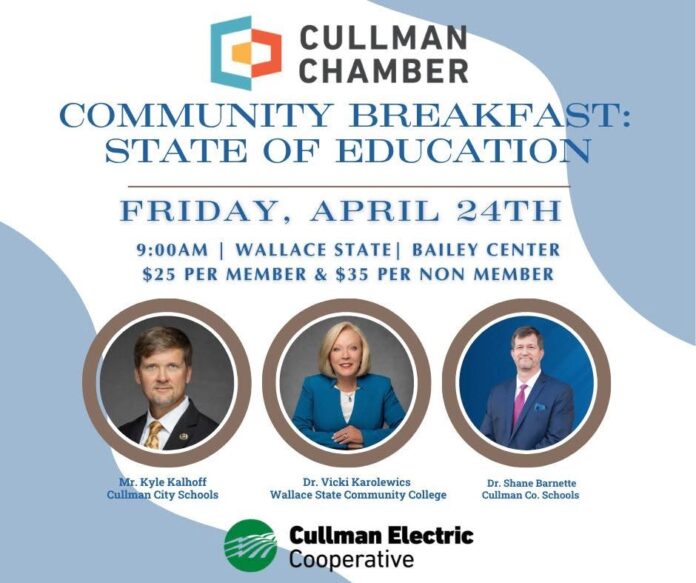 The Cullman Area Chamber of Commerce will host the State of Education community breakfast Friday, April 24, from 9-11 a.m. at the Bailey Center on the campus of Wallace State Community College. (Cullman Area Chamber of Commerce)