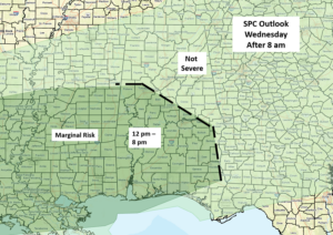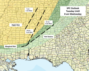 A cluster of strong to severe storms will move into northwestern Alabama Tuesday evening, then move southeastward overnight, likely dropping below severe levels once it reaches I-20 by early morning Wednesday. However, re-strengthening is possible on Wednesday afternoon, south of I-20. Damaging straight-line wind gusts are the main threat Tuesday into Wednesday, although a tornado or two cannot be ruled out. However, the overall tornado threat is currently low.