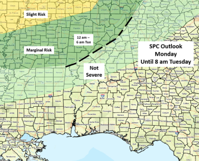 An area of thunderstorms with heavy rainfall will move into the far northern portions of the state around 12 am tonight and continue southward into Tuesday morning, weakening once reaching I-20. A few wind gusts from 40-60 mph and very heavy rainfall are possible north of I-20.