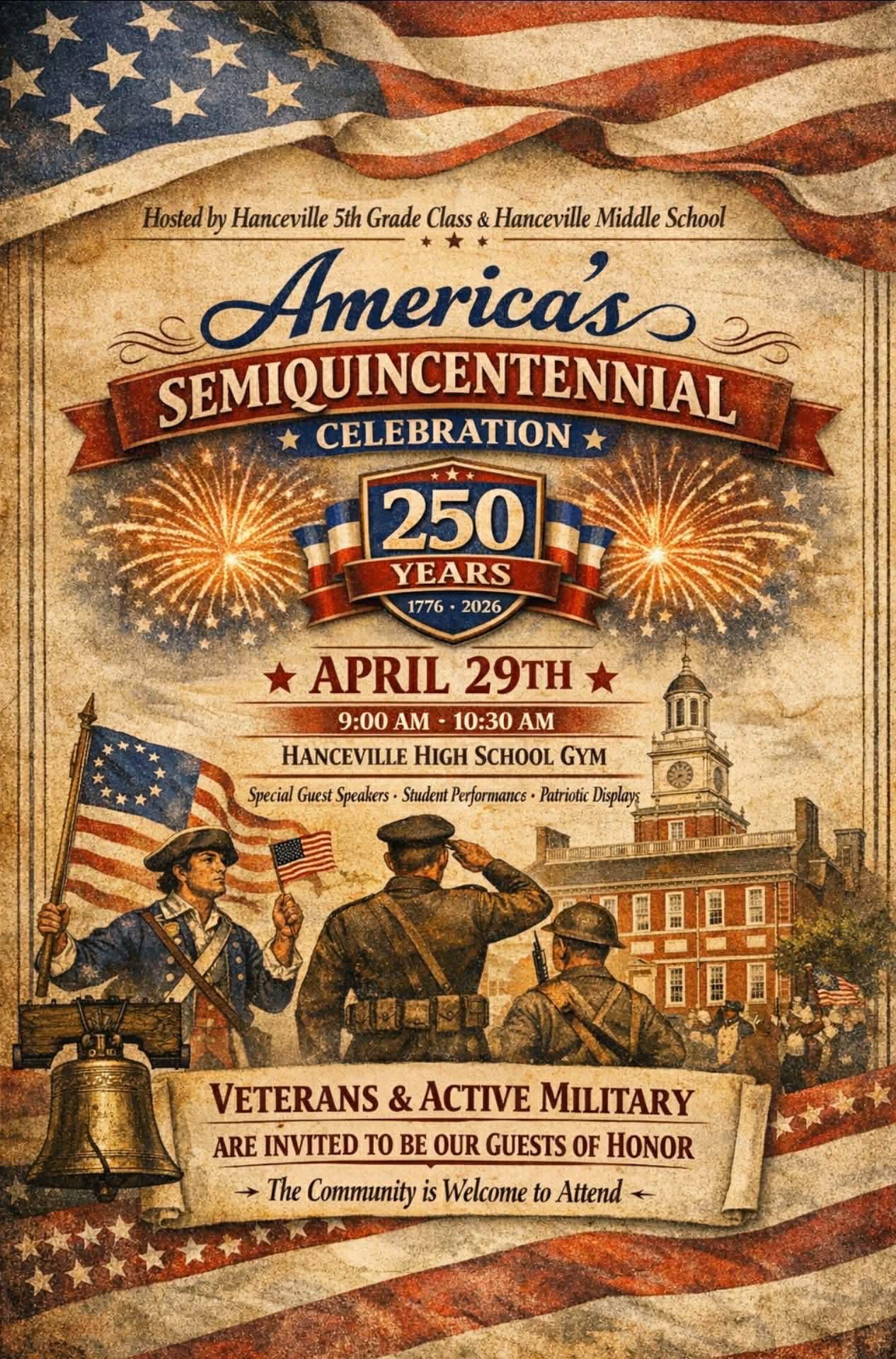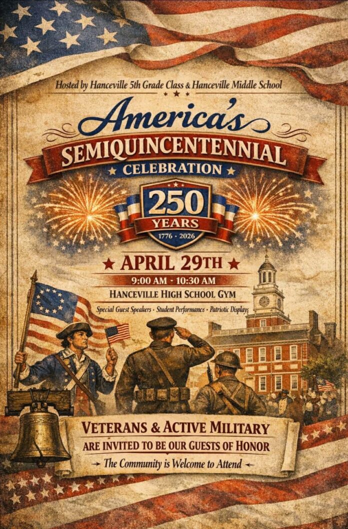 The America’s Semiquincentennial Celebration is scheduled for 9-10:30 a.m. Wednesday, April 29, in the Hanceville High School gym.