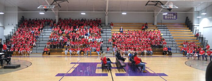 Students, faculty, staff and community members gathered for the celebration, which also saw tribute paid to veterans in attendance. Special seating was given to veterans and active-duty service members, and during a performance by Hanceville Middle School fifth-graders, they were prompted to stand for applause.